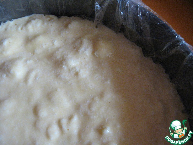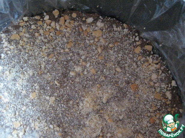 Форму с диаметром 18 см застелить пищевой пленкой. Выложить на дно основу разровнять. Масса сильно липнет к рукам-эту проблему полностью решает 1 ст. л. измельченного печенья. Просто насыпать сверху и по нему разравнивать рукой.