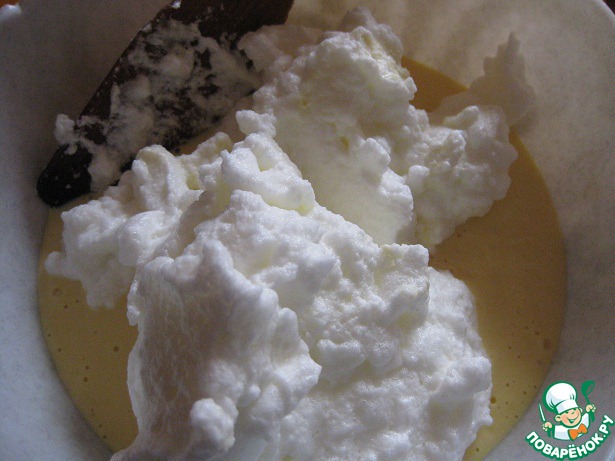 Белковую массу осторожно в несколько приемов ввести в творожно-персиковую.