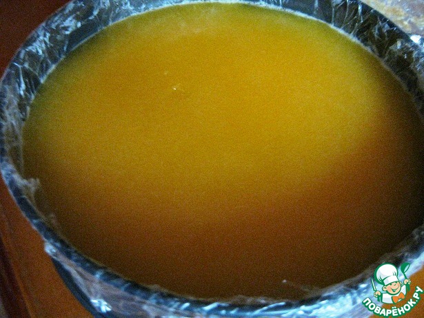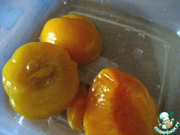 Теперь берем сироп от персиков 1 стакан, растворяем в нем 1 ст. л. желатина. Оставляем до набухания. Затем прогреть до полного растворения желатина.