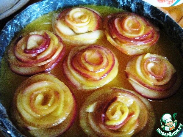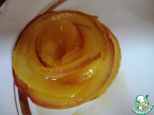 Делаем розу. Берем 1 ломтик, сворачиваем его рулетиком, затем два вокруг первого, затем еще и еще.