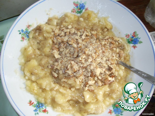 Измельчаем грецкие орехи и высыпаем к бананам, тщательно перемешиваем.