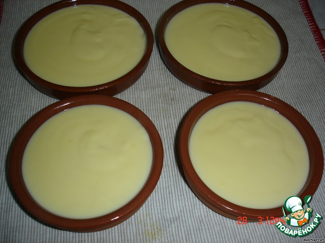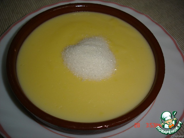 Соединяем желтки с сахаром и разведенный молоком крахмал. Из теплого молока вынимаем цедру лимона и корицу, доводим до кипения, и постепенно вливаем приготовленную смесь, непрерывно мешая, доводим до загустения, но не кипятим.