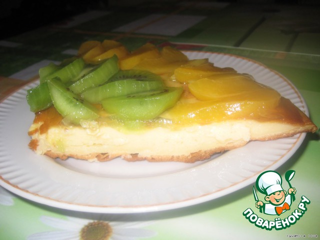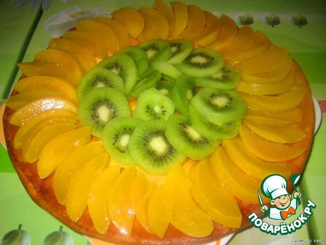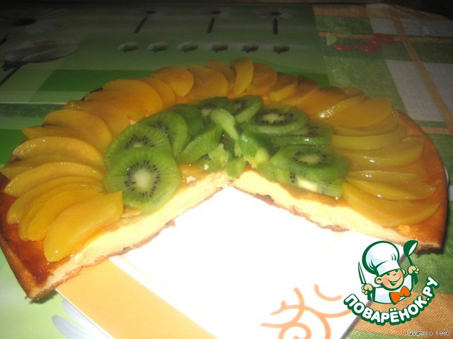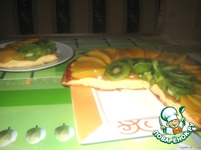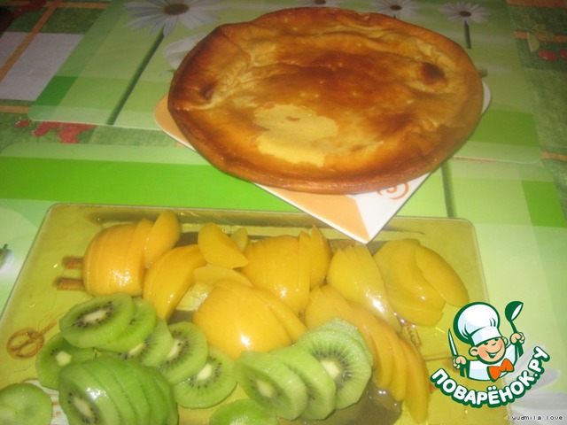 Остужаем флан.Подготавливаем фрукты для украшения.У меня персики консервированные и свежее киви!=)