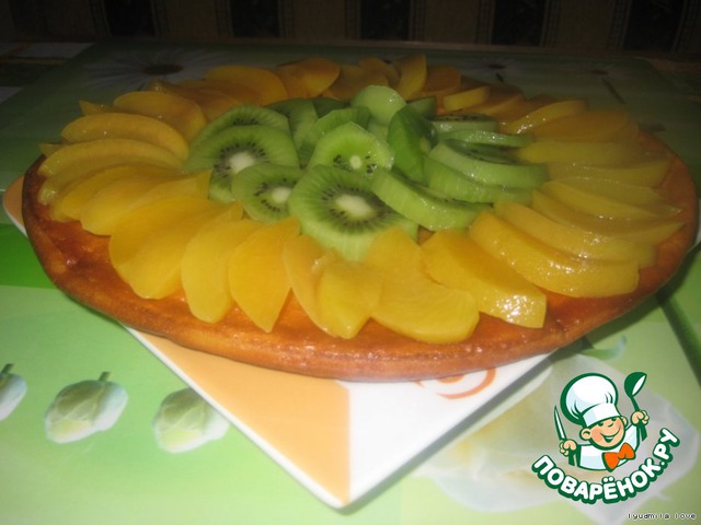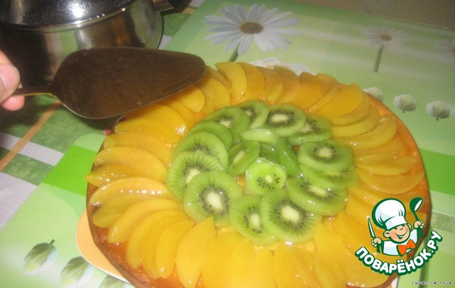 Залила приготовленным горячим желе фрукты...лила не жалея...оно вкусненькое...=)))И разровняла по фруктам лопаточкой.