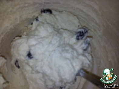 Добавить частями просеянную муку и разрыхрытель. Тесто должно получиться мягким, но с ним возможно работать. Добавляем изюм, перемешиваем.