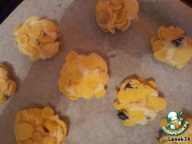 Высыпать хлопья в миску. Зачерпнуть ложкой тесто (половину ст.ложки примерно), опустить в миску и как следует обвалять в кукурузных хлопьях, вдавливая их внутрь.
