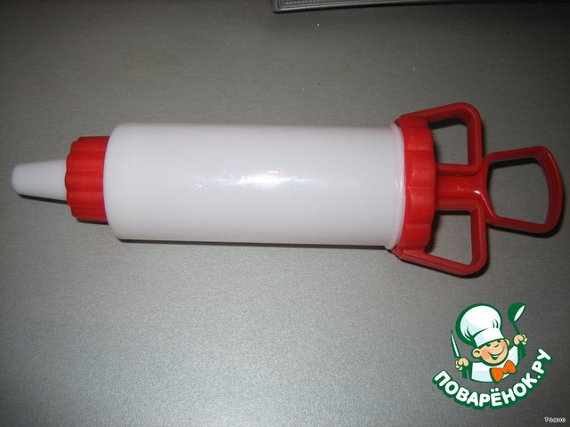 Духовку нагреть до 220 градусов. Взять кондитерский шприц (у меня вот такой) или мешок с насадкой.