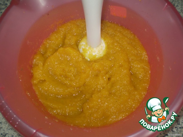 Готовые тыкву и банан охладить и измельчить блендером до пюреобразного состояния.Разбухший желатин подогреть на водяной бане до полного растворения и соединить с тыквенно-банановым пюре.Поставить в холодильник до полного охлаждения, но не застывания.