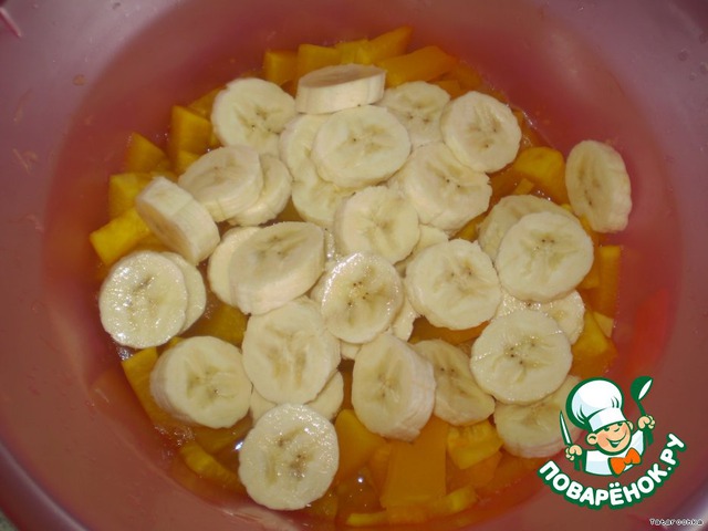 Затем сок, выделившийся из тыквы слить в посуду, к тыкве кружочками нарезать банан и ещё на 4 минуты в микроволновку.В остывшем соке замочить желатин.