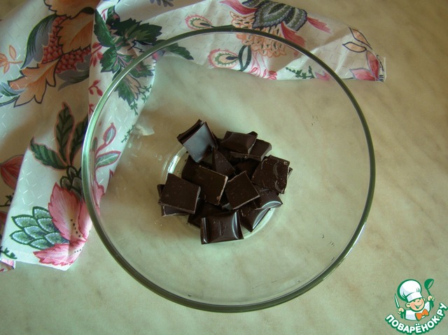 Тем временем приготовим крем: шоколад поломаем на маленькие кусочки и отправим на водяную баню до полного растворения.