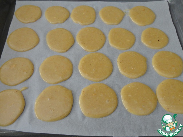 С помощью кондитеского мешка (или обычного мешка, срезав уголок) отсаживаем печенья на противень, оставляя расстояние между ними.