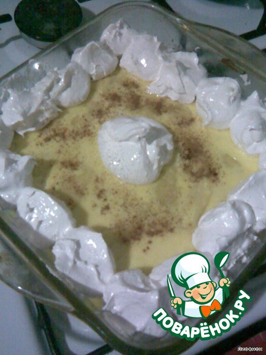 тем временем взбить оставшиеся белки с сахаром в крепкую пену.Достать форму с клецками и выложить на них безе по периметру.Свободное пространство посыпать корицей.
