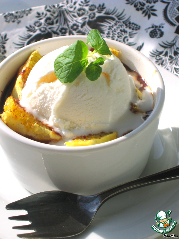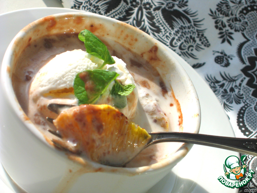 Достаем десерт из духовки, в центр помещаем шарик ванильного мороженого, можно украсить листиками свежей мяты.