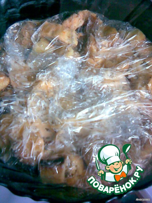 заворачиваем края пленки,придавливаем,чтоб крем хорошенько разошелся,затек во все места тортика.и ставим в холод,кто как удержится.У меня простоял меньше часа,дети не дали толком застыть.