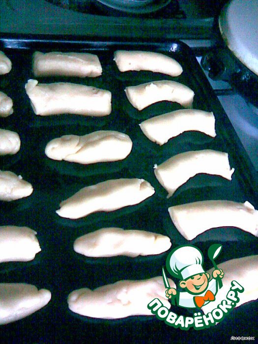 у пакета отрезать уголок и небольшими порциями выдавить тесто на смазанный противень.(у меня процессе выдавливания пакет лопнул и я уже скатывала "колбаски" руками.)