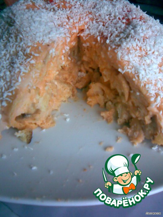достаем,аккуратно снимаем пленку,переворачиваем на блюдо и украшаем на свой вкус.Я посыпала просто кокосовой стружкой.Вот такой получился тортик в разрезе.