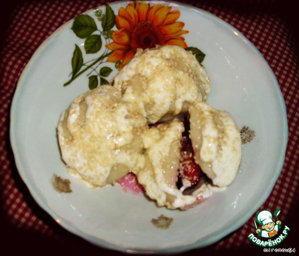После пятиминутной экзекуции в кипятке вынимаем наших "готовеньких пловцов" на блюдо, обильно поливаем густой сметаной, посыпаем слегка поджаренными на сливочном масле панировачными сухарями и горячими подаем на стол.