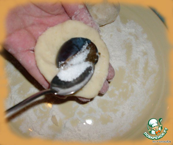 Из готового теста сначала скатываем шарики диаметром 3-4 см. потом шарики плющим в небольшие лепешечки, укладываем в них оперированный фрукт, в разрез засыпаем сахар по вкусу, или половинку чайной ложечки меда...