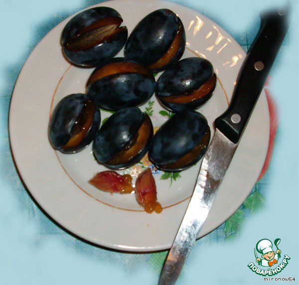 У сливы (алычи, терна) делаем хирургический надрез и аккуратно вынимаем косточки, так, чтобы плод не разделился на дольки...