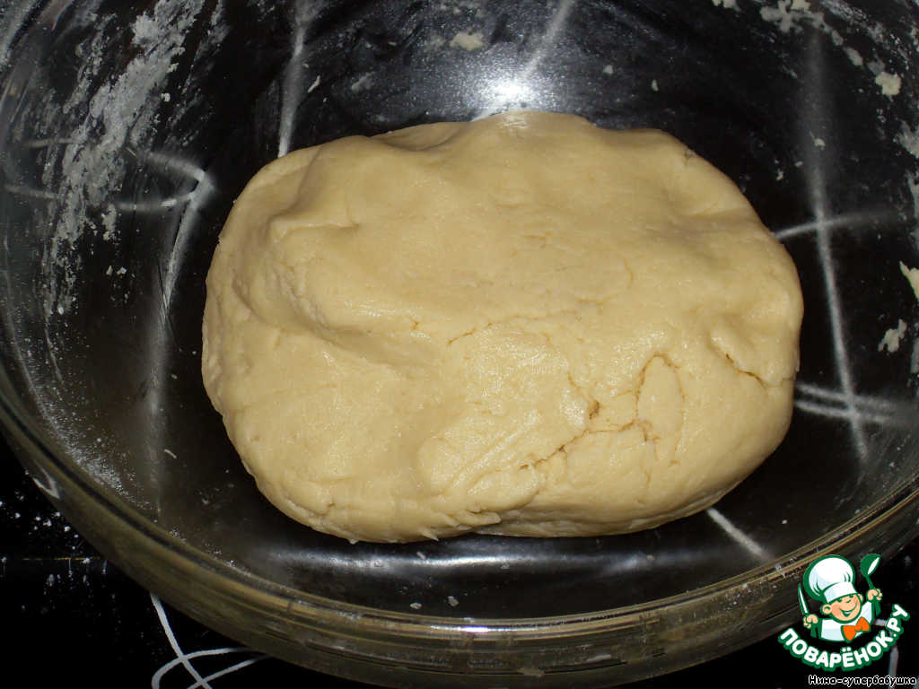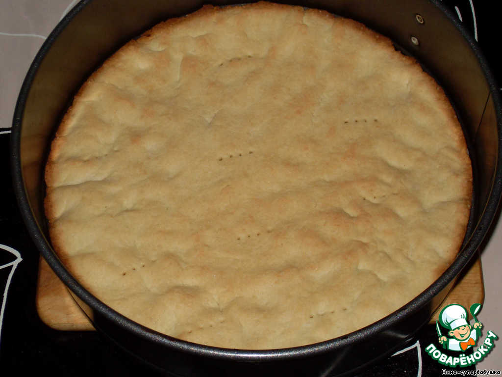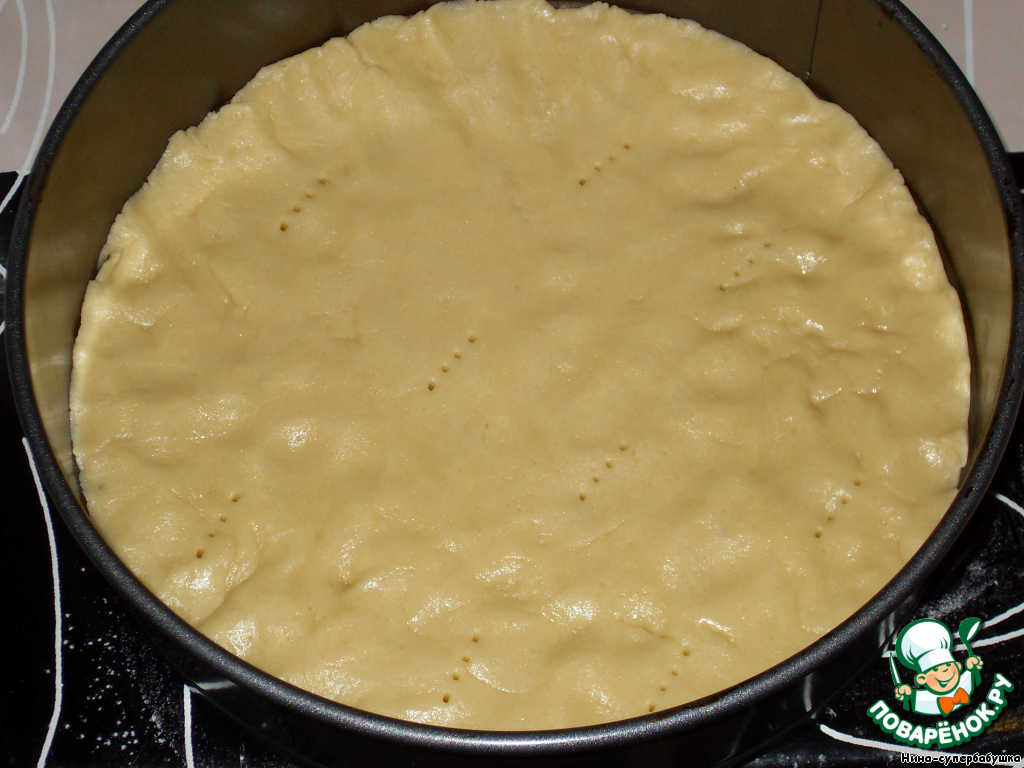 Выложить тесто в форму, застеленную пекарской бумагой, которую надо смазать слегка маргарином. Размять ровным слоем по всей поверхности. Многократно наколоть вилочкой.