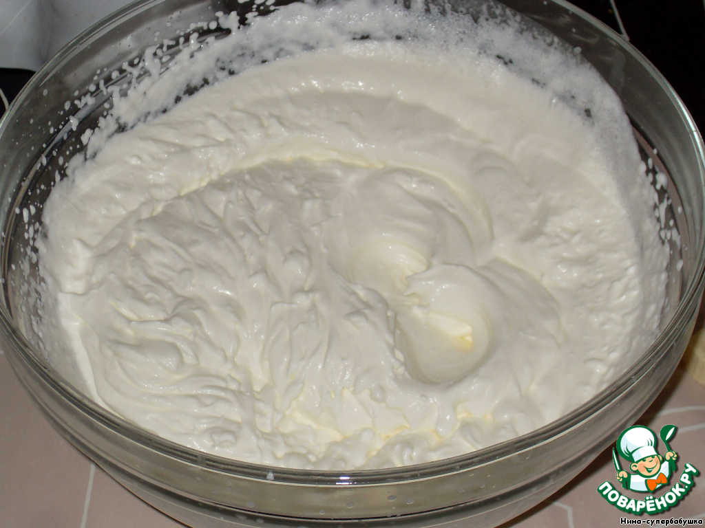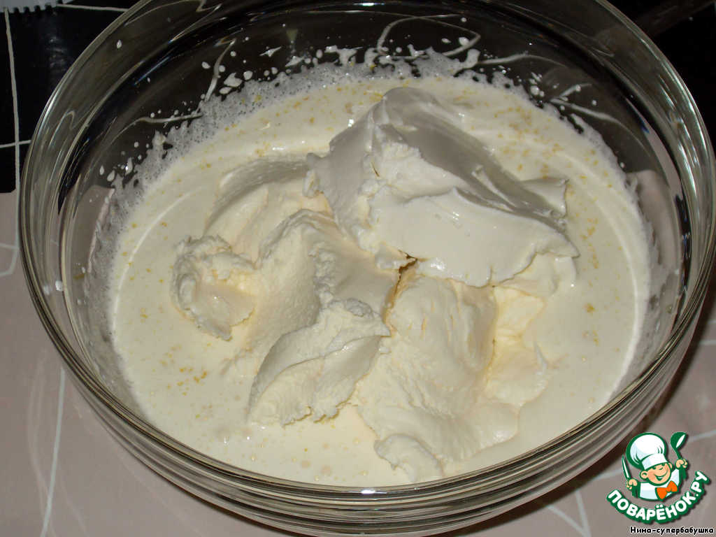 К взбитым желткам добавить творожный сыр (или творог) и хорошо все взбить. Добавить кусочки апельсина и перемешать.