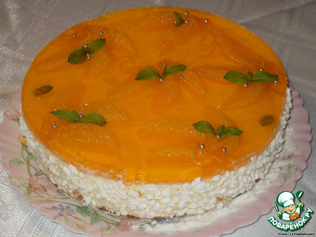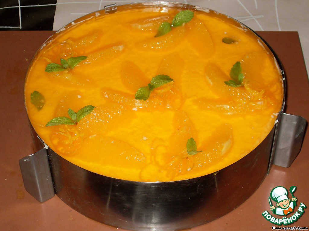 Дольки апельсина разложить на торте, посыпать тонко нарезанной цедрой апельсина, аккуратно залить желе. Украсить листиками мяты. Убрать на холод до полного застывания. Я взяла желтое желе и пожалела потом об этом. Надо было взять прозрачное, тогда дольки апельсина и цедра были бы хорошо видны. Можно вообще не заливать желе, просто украсить дольками апельсина, стружкой из цедры и листиками мяты.