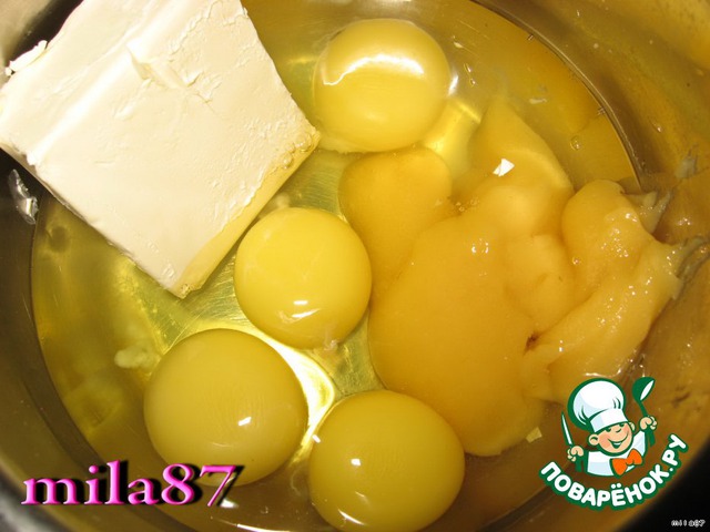 Ставим на огонь кастрюлю с водой. В меньшей кастрюльке смешиваем масло, мед и яйца.