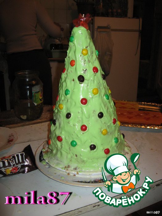 Затем обмазываем зелеными сливками, украшаем конфетами, закрепляем звезду-мармелад... и угощаемся..