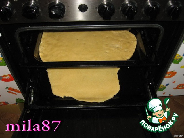 Тесто делим на две части, одна больше другой, выкладываем в смазанный противень.