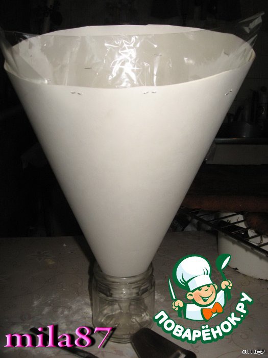 Из плотного картона делаем кулек, закрепляем степлером и укладываем внутрь пленку.