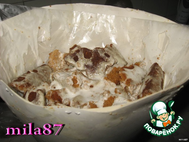 Тесто ломаем на кусочки и окунаем в сметанный крем, укладываем в кулек, укладывая в узком месте маленькие кусочки, постоянно увеличивая размер кусочков коржа.