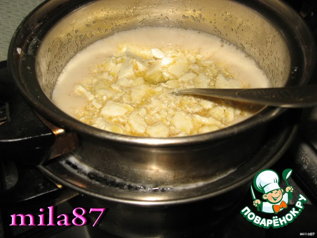 Ставим меньшую кастрюлю в большую, варим на водяной бане до растворения сахара и масла, до увеличения массы в размере.