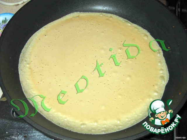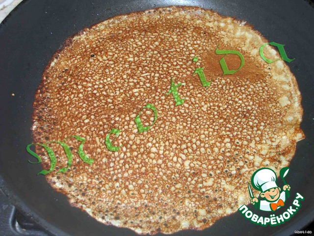 Черпачком:) наливаем тесто в сковородку, ждем пока края не станут коричневеть, тогда аккуратненько лопаточкой отделяем краешки от сковородки и пальчиками быстренько переворачиваем наш блин :)