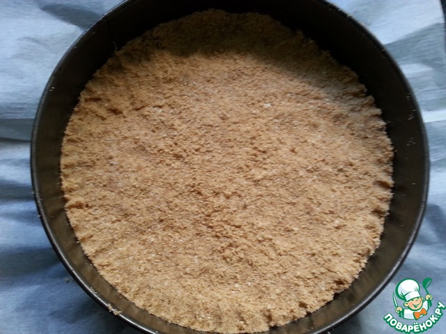 Смешать крошку с маслом, разъемную форму выстелить пергаментом (дно). Выложить тесто и хорошо утрамбовать. Убрать в холод.