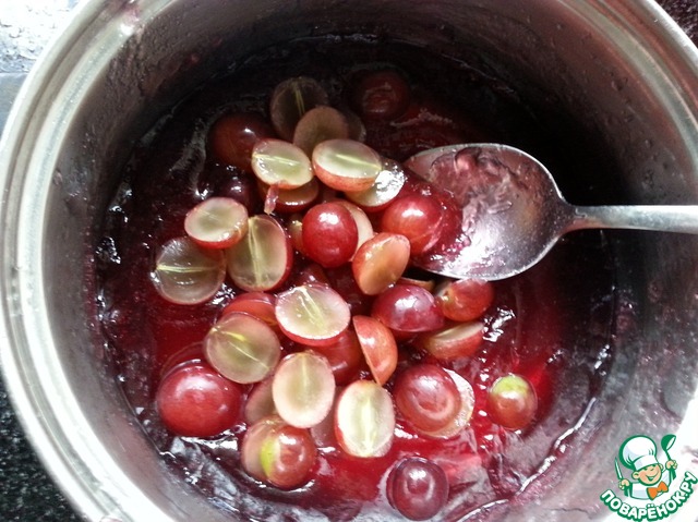 Приготовить желе по инструкции на упаковке. Виноград разрезать пополам и добавить в желе.