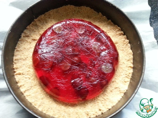 Миску, или другую подходящую форму ( чтобы повторяла форму торта, но меньше в диаметре) выстелить пленкой. Выложить в миску желе и в холод до застывания.