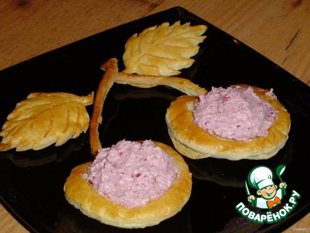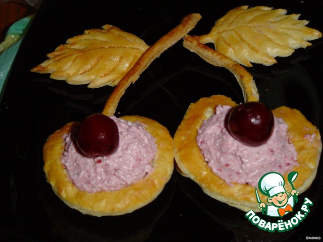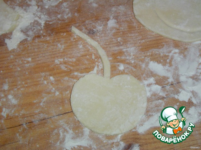 Раскатываем слоеное тесто и с помощью шаблона вырезаем вишенки и листочки.
