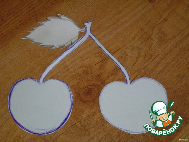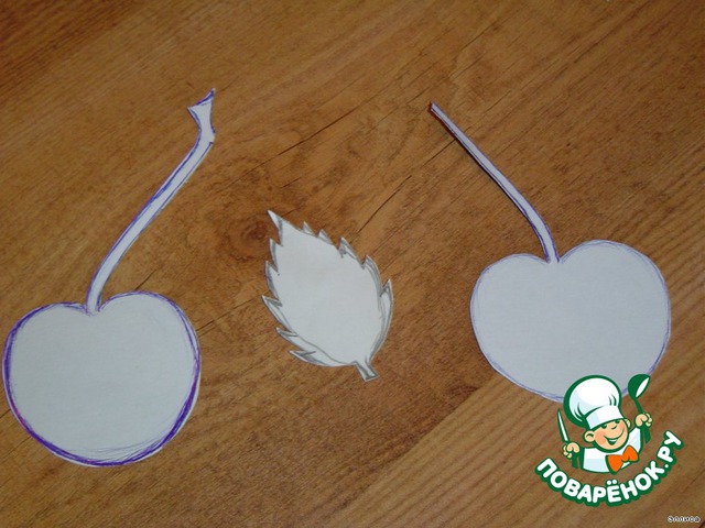 Прежде всего изготовим шаблоны вишенок и листика, нарисовав их на картоне и вырезав.