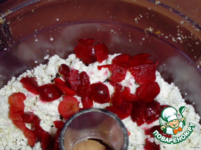 Все ингредиенты измельчаем и смешиваем,и начиняем наши вишенки.Украшаем целыми вишенками.
