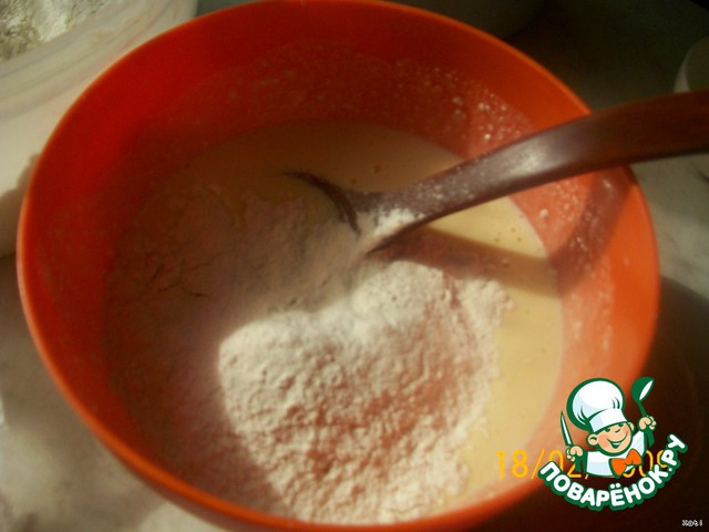 Далее смешать разрыхлитель с мукой и хорошенько все перемешать