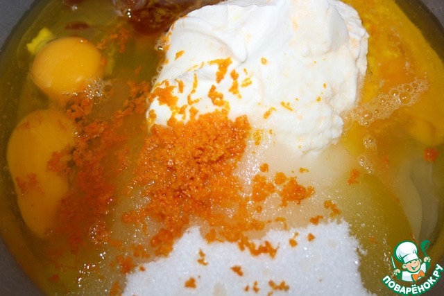 2. Соедините йогурт, сахар, яйца, сок и цедру апельсина, ваниль и оливковое масло и взбейте до однородности.