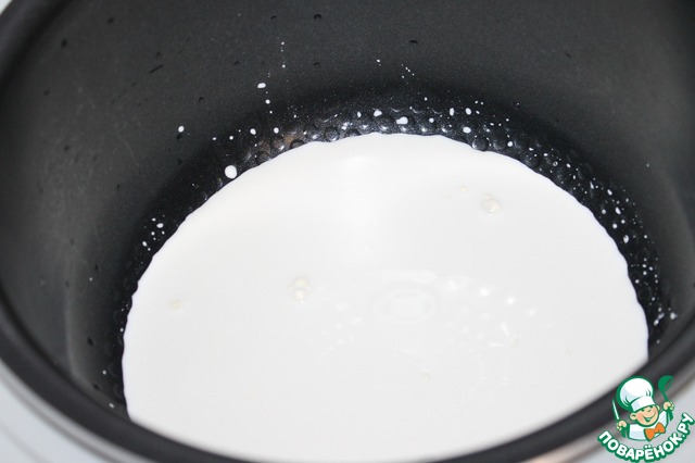 Теплые сливки смешать с 10г сахара, и вылить в чашу мультиварки