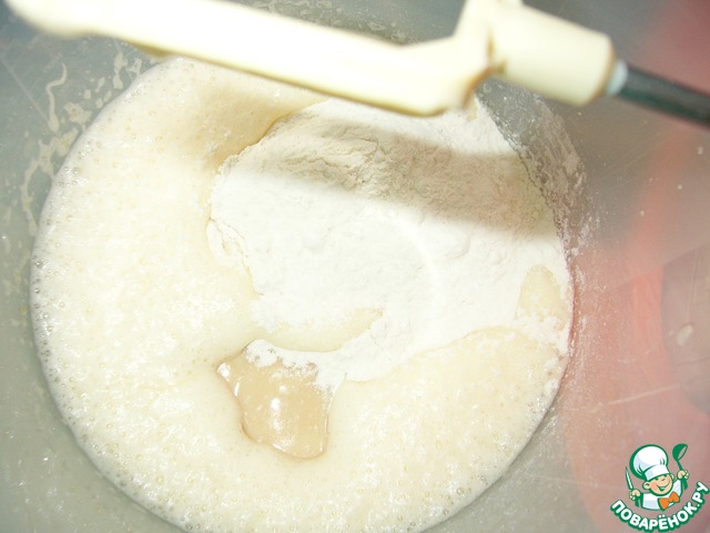 Добавить сгущёнку, ванилин, муку, предварительно смешанную с разрыхлителем