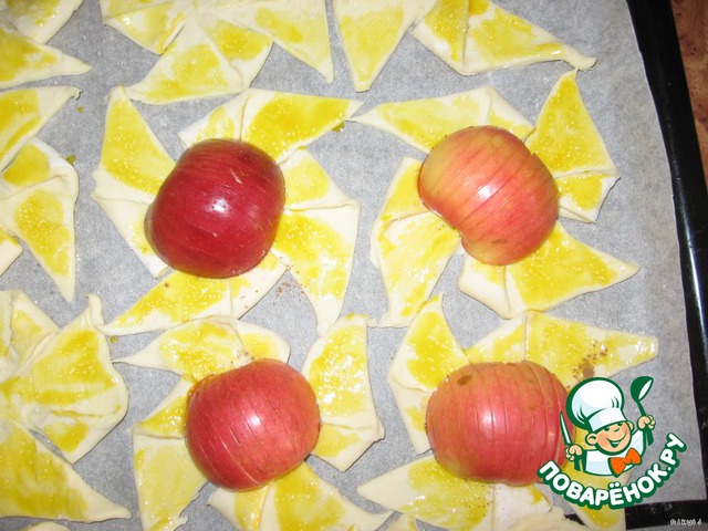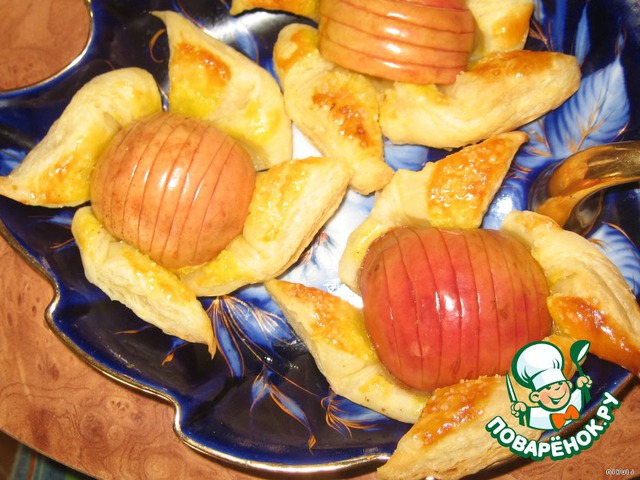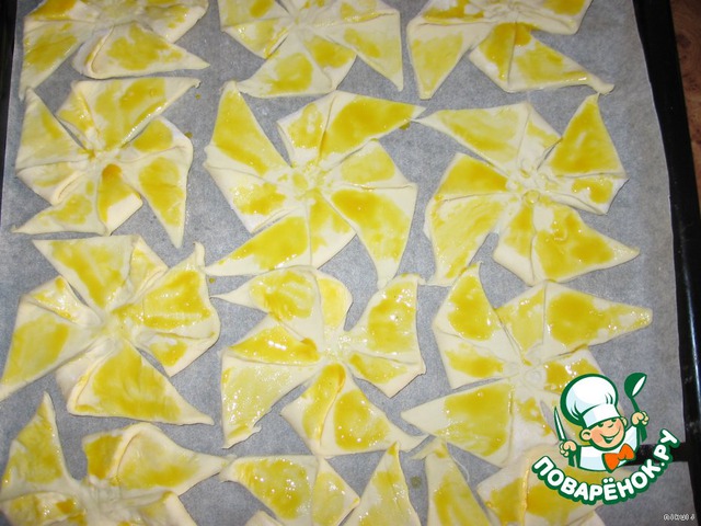 | Выпечка из слоеного теста, очень нравится сама форма изделия (подсмотрела в кулинарной книге ). Муж называет цветочками... |