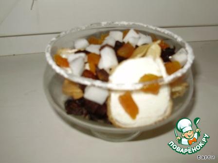 Кокос, чернослив и курагу нарезаем небольшими кубиками и живописно раскладываем сверху мороженного.