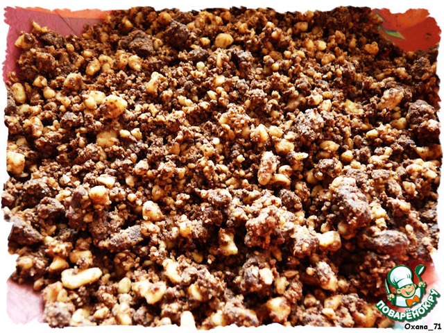 Если вы заметили, в этом торте нет муки. Я не использовала панировочные сухари, вместо них добавила побольше орехов и печенье, т. е. 200 гр сухарей заменила на 100 гр орехов + 100 гр печенье.