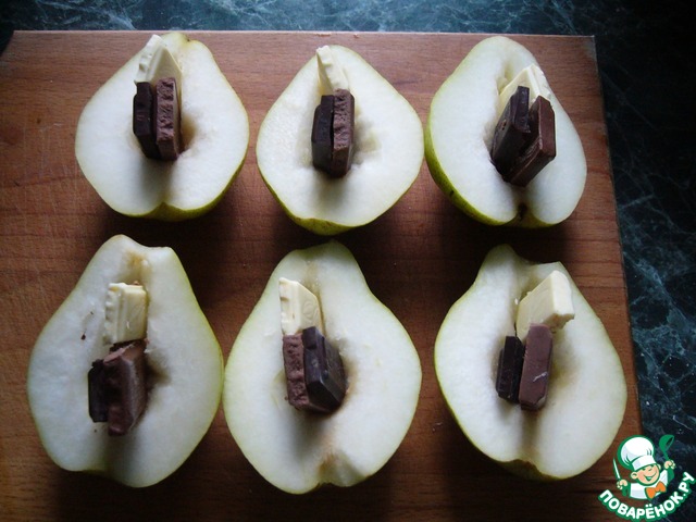 Подготовить груши-разрезать на половинки, вынуть семечки, вставить во внутрь 3 кусочка разного шоколада (белого, молочного и горького)