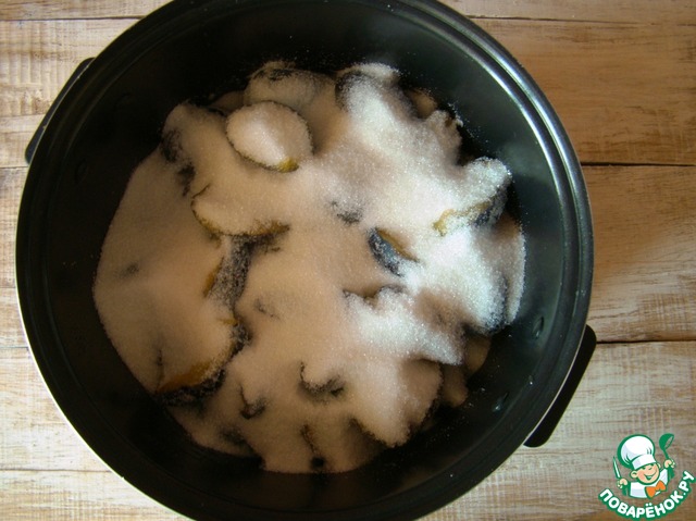 Сливы освободим от косточек и пересыпим сахаром. Оставим на 1 час, чтобы слива пустила сок. После истечении этого времени вливаем еще 100 мл воды и включаем режим ТУШЕНИЕ на 20 минут. Следим, чтобы не пропустить момент кипения, т. к. пена может подняться и выходить через верхний клапан для конденсата. Открываем крышку и собираем пену до конца программы.