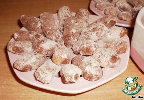 Выпекать нужно минут 30-40. Если честно, то моя духовка справилась с этим быстрее. Когда печенье испеклось, вынимаем его из духовки и выкладываем на блюдо. Даем хорошо остыть. Практически полностью. А в это время готовим сахарную пудру и какао. В идеале нужно практические холодные печенюшки обмокнуть сначала в сахарной пудре, а затем в какао порошке. Скажу честно, что я попробовала так сделать, но плюнула на все и смешала в одной тарелке пудру и какао и обмакивала печение в уже готовой смеси ;).