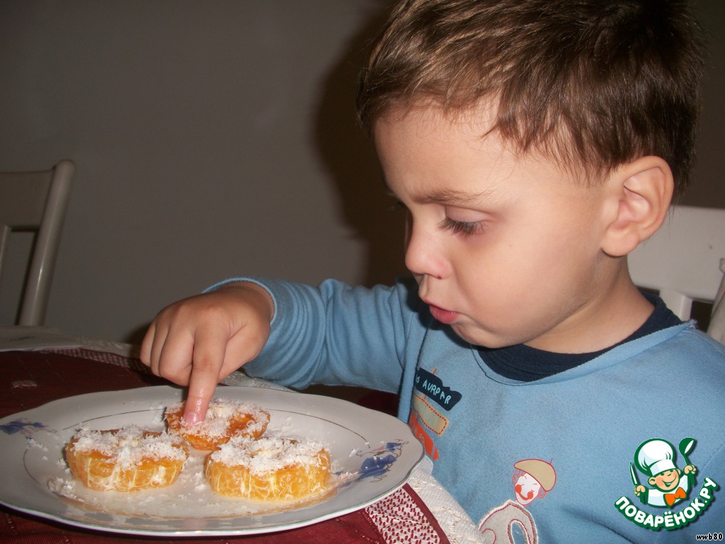 | Новый год - это запах мандаринов и ели, ощущение праздника и радости, вера в чудеса и исполнение желаний! К сожалению, в Ливии нет праздника Новый Год ... нет елей, нет снега... Но есть мандарины и желание самим устроить праздник! Помню, как в детстве я любила ловить языком падающие снежинки. Сегодня для сына я приготовила вкусные снежинки-мандаринки. |